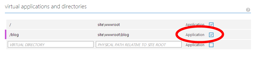 It turned out to be an easy fix, though. In the website’s Configuration page in your Azure portal, head down to the ‘virtual applications and directories’ section. All you have to do is check the ‘Application’ check box for your virtual directory.